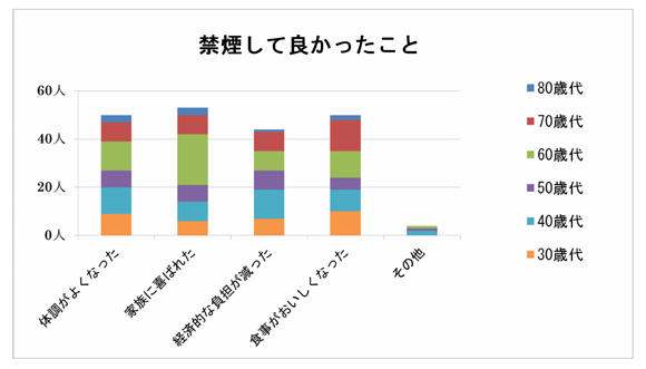 以前に喫煙をしていたが現在は禁煙をしたという人へのアンケート結果から、"体調が良くなった"、"家族に喜ばれた"、"経済的な負担が減った"、"食事がおいしくなった"などの回答が多くありました。